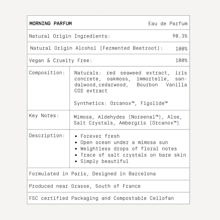 Subtiliai dekadentiškas rūkstančių miškų ir hipnotizuojančių gėlių mišinys apgaubia odą ir sukuria gilų, ilgalaikį įspūdį. Sodrių sandalmedžio, kedro ir ąžuolo samanų natų sintezė sulieja karčiųjų raudonųjų jūros dumblių ekstraktą, suteikiantį sūraus gaivumo, drėkinančių ir mineralizuojančių savybių. Iris ir Immortelle gėlių duetas atskleidžia tekstūruotą komfortą su zomšos ir žemiško molio akcentais.