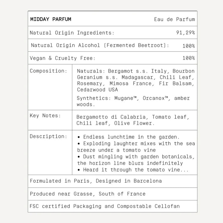 Žalios spalvos sprogimas visais jos atspalviais. Traškus Kalabrijos bergamotės putojimas, putojantis virš rožinės mėtų pelargonijos, skaniai kartaus pomidorų lapų aromatas susimaišęs su dulkėtu čili lapų prieskoniu. Alyvuogių gėlių ir mimozų prisilietimas atskleidžia raminantį gėlių kvapą, kuris saldžiai sklendžia ant odos.