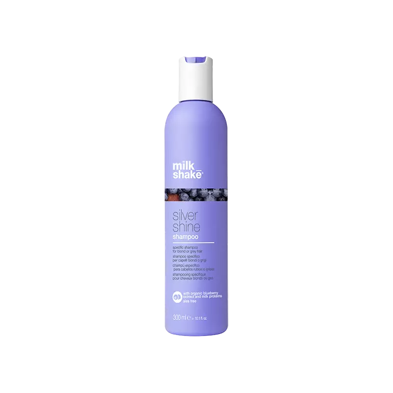 Milk Shake Silver Shine Shampoo 300ml specialistų sukurtas šampūnas rūpestingai žilų ir šviesių plaukų priežiūrai. Šis šampūnas padeda panaikinti nepageidaujamus geltonus atspalvius nuo šviesintų ar žilų plaukų, kurie atsiranda dėl daug rūdžių turinčio vandens ir kitų išorinių veiksnių. Praturtintas violetiniu spalvos pigmentu, šis šampūnas efektyviai neutralizuoja geltonus ir auksinius atspalvius, sumažina šiltus pustonius plaukuose. Plaukai įgauna šaltą atspalvį ir pavydėtiną spindesį, pagyvina ir atnaujina tyrą, šviesią plaukų spalvą. Sudedamoji dalis glicerinas, gaunamas iš natūralių aminorūgščių darinių. Natūralus glicerinas turi savybes – gerai sugeria drėgmą ir padengia plaukus lengva švelnia plėvele, stiprina, minkština ir drėkina plaukus. Uogų ir vaisių ekstraktai padeda atkurti pažeistą plaukų struktūrą, plaukai tampa blizgūs, lengvai šukuojami bei minkšti. Švelnūs valantys ingredientai tausoja silpnus ir brandžius plaukus. Milk Shake Silver Shine Shampoo šampūnas yra be SLES, neišsausina galvos odos, todėl tinka kasdieniniam naudojimui.